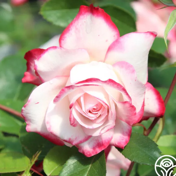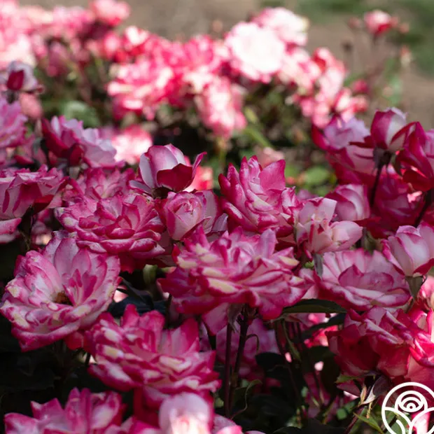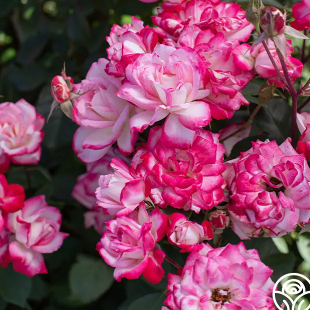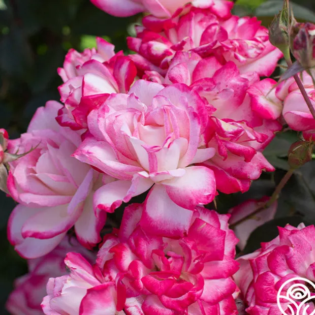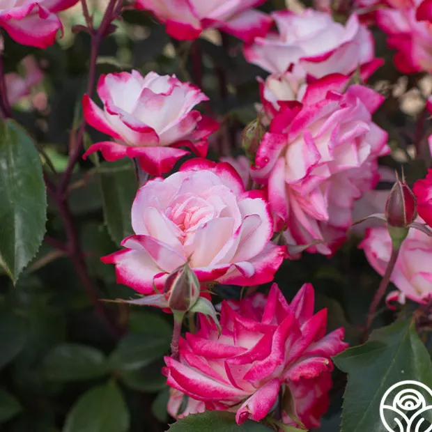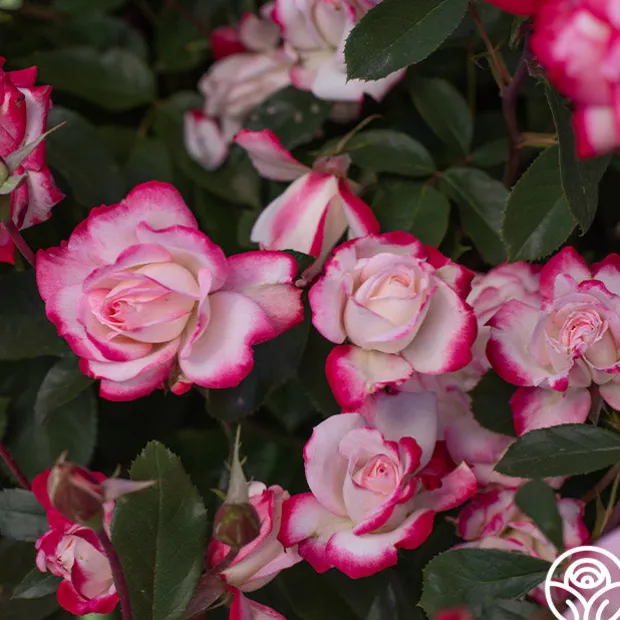 This holiday-themed Floribunda displays lovely, bi-colored blooms of white suffused with deep pink to red edges. Candy Cane Cocktail™ has superior qualities and has inherited its exceptional rebloom and disease resistance from the line of Knock Out Family of Roses. Add this rose to your cutting garden for delightful blossoms all season long.