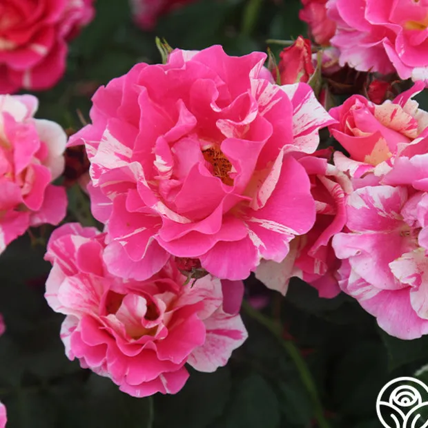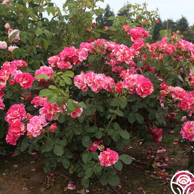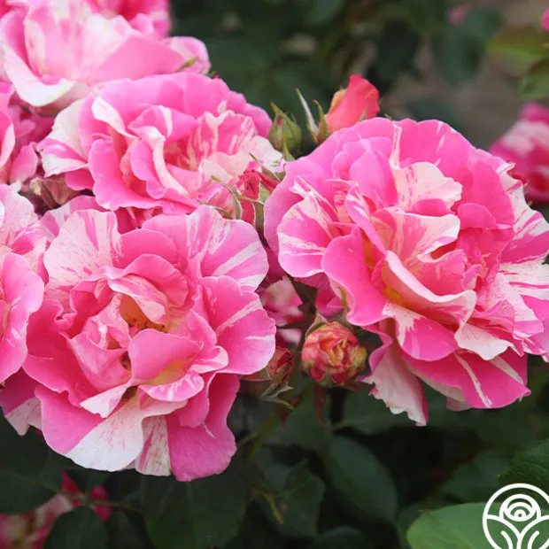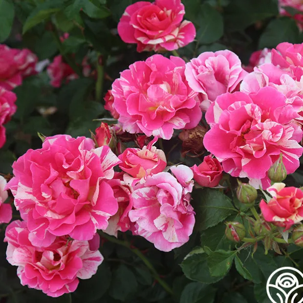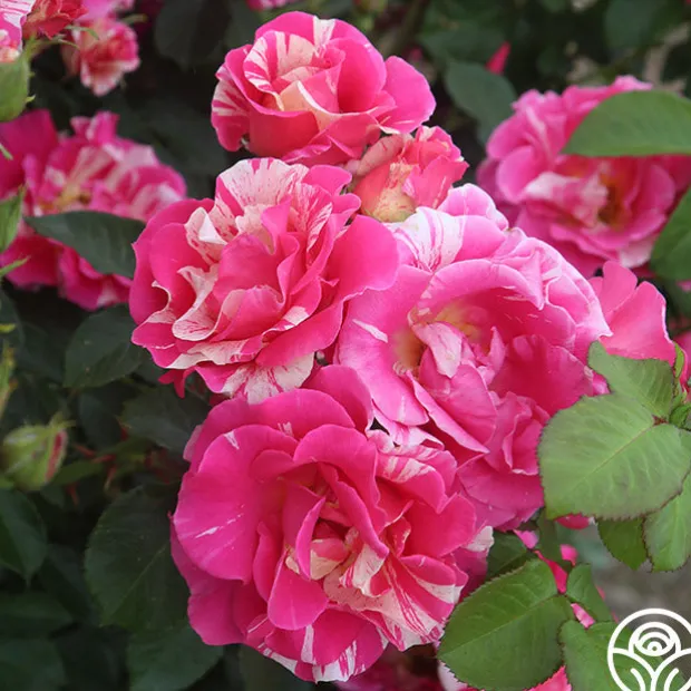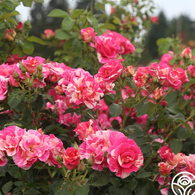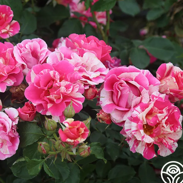 Candy Land is as delicious as she sounds with a delightful tea fragrance and button-eyed, high-centered blooms. Her blooms of rosy pink blend with stripes of cream and are borne in large clusters against large, glossy, light green foliage. Candy Land’s 4” blossoms make excellent cut roses and perform well in zones 5-9.