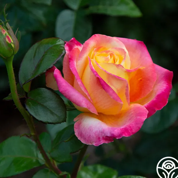 This Hybrid Tea features a moderate myrrh fragrance and beautiful yellow and pink colors. The outer edges of the petals show off a blushing pink color while the center glows with yellow. Love & Peace®’s blooms average 5.5” in diameter and sit atop long, sturdy stems with a profusion of glossy, green leaves. She is a vigorous grower, perfect for the cutting garden, with large solitairy blooms. While she does great in beds and borders, Love and Peace® may also be grown in a container with appropriate winter protection.