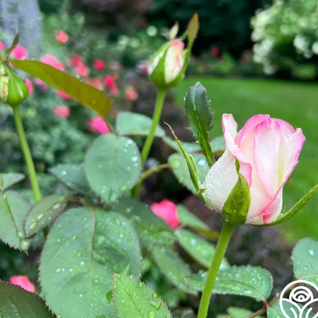 Like moonstone gems that produce a milky, blush pink, iridescent shimmer, our Moonstone™ produces huge, 6″ blooms of a soft cream that are finely edged in delicate pink. The blooms have a petal count of 30+ and emit a mild, nutty rose fragrance, making it a wonderful cut flower. This continual bloomer is a “must-have” for gardens in drier climates as she doesn’t care for too much moisture.