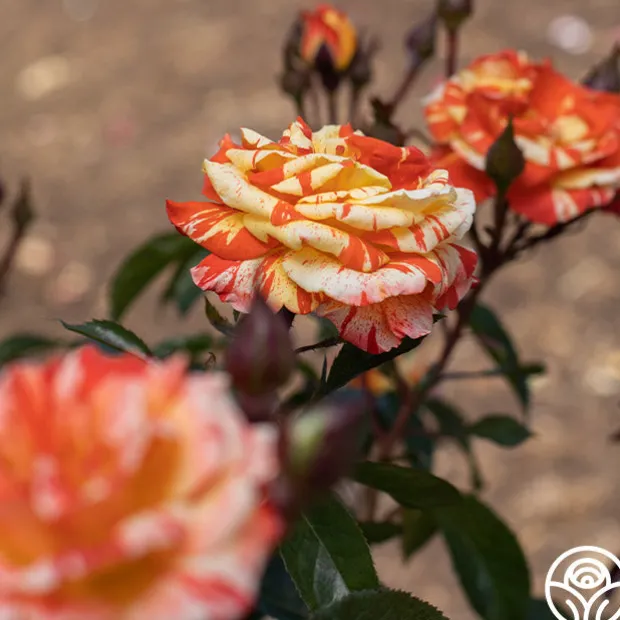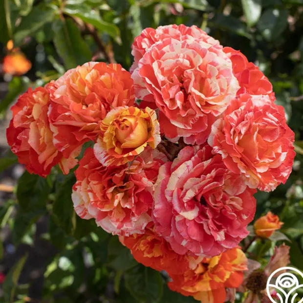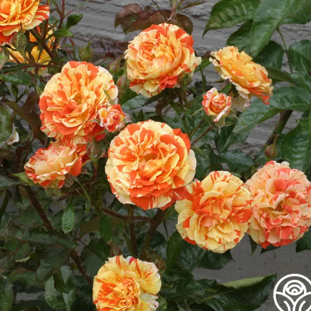 Medium to large, fully double, 4” blooms with 30+ petals are produced in clusters on Oranges ‘n’ Lemons. Her flowers are striped, speckled, and streaked with peachy cream coloring that fades gently as she ages. Her roses have a mild fruity fragrance and a delightfully unique coloring.