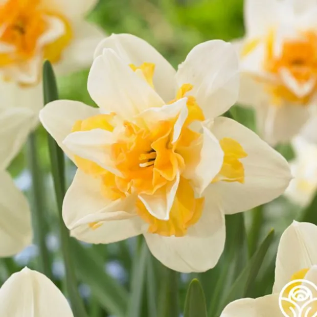 Note: Bulbs ship starting in October based on availability and your zone, unlike other products. Plant around or after your first frost but before the ground freezes. Sweet Desire looks like candy with her double form and creamy-white outer petals leading to bright tangerine inner whorled petals. She can handle temperatures down to zone 3 and tops out around 16” tall. Sweet Desire will bloom in early spring and makes a great cut flower to bring inside and enjoy. This heavily ruffled Daffodil is deer resistant and easy to grow.