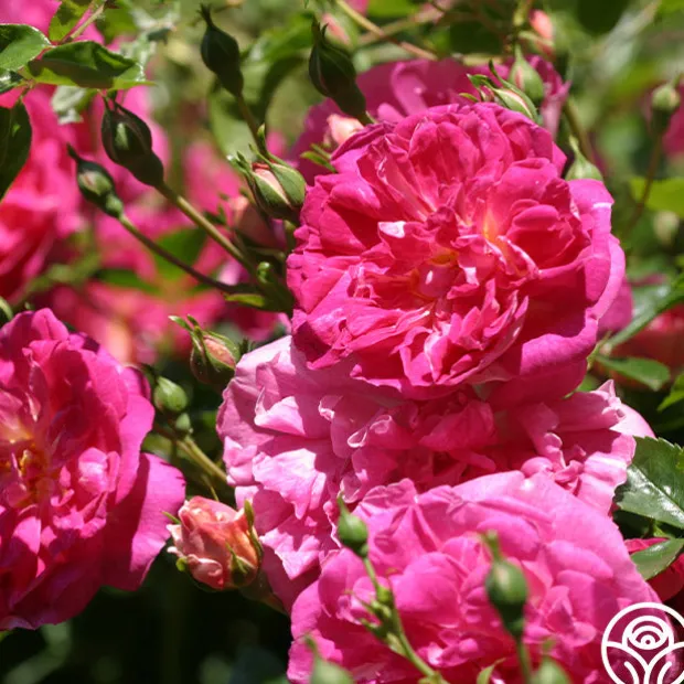 Alexandre Girault is a once-blooming Rambler with reddish-rose-pink, 2” blooms with 15+ petals each against glossy, green foliage. He emits a strong apple fragrance. Give Alexandre Girault space to grow as he will reach a width up to 8’ and a height up to 11’ tall.