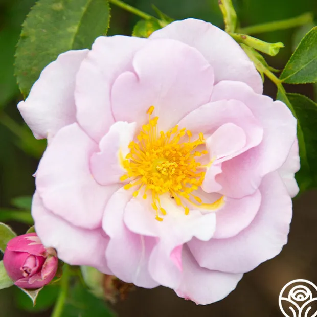 Blueberry Hill continually draws favorable comments from all who meet her. Her large, semi-double, 4” blooms are a beautiful shade of clear, unfading, lilac-lavender that open to show striking, golden centers. This continuously blooming plant has a slight apple, rose fragrance. Perfect for zone 5 and up, Blueberry Hill will also produce beautiful hips in the fall.