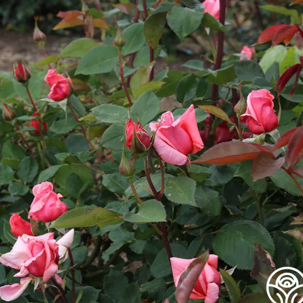 Leaping Salmon produces huge, double, salmon colored, 4″ blooms with 15-24 petals each. Her blossoms form singly and cascade in clusters on strong cutting stems. Expect upright and arching canes with large, semi glossy foliage. Leaping Salmon is a great choice for a vertical cutting garden!