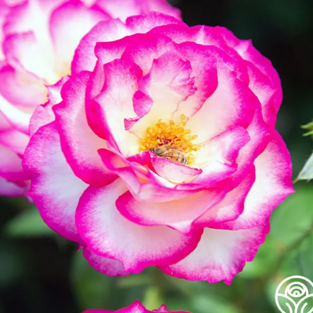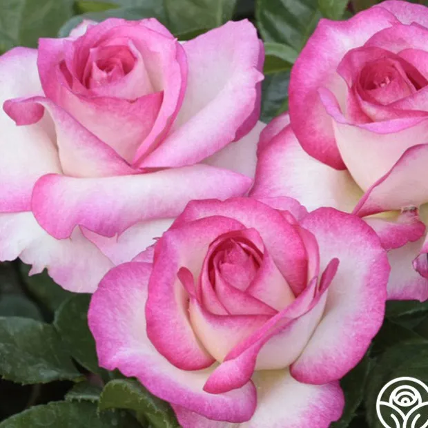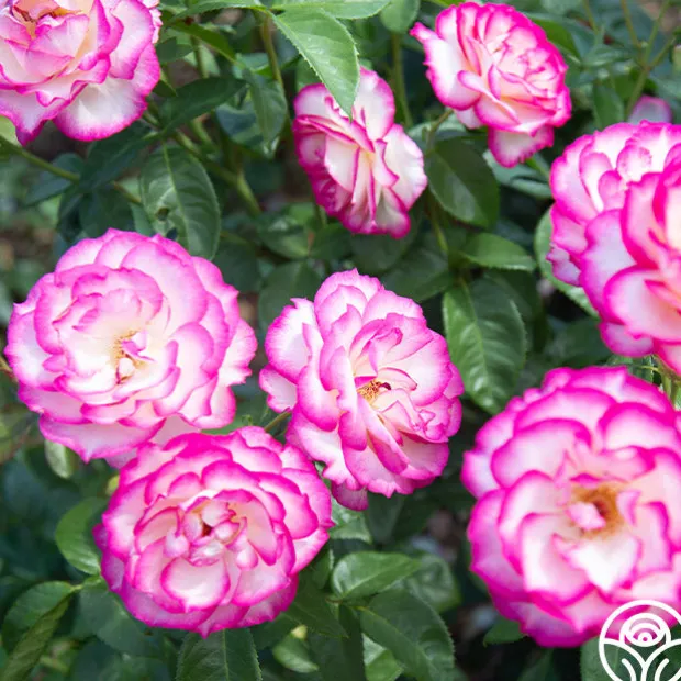 Born in flushes throughout the season, this crown-worthy beauty is definitely one of the most charismatic roses in the garden. Photo-ready blossoms of pure white are kissed with vivid pink at the edges and feature large, glossy leaves and a moderate fragrance. It’s no wonder she’s a garden star!