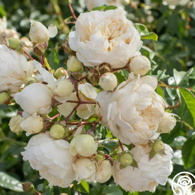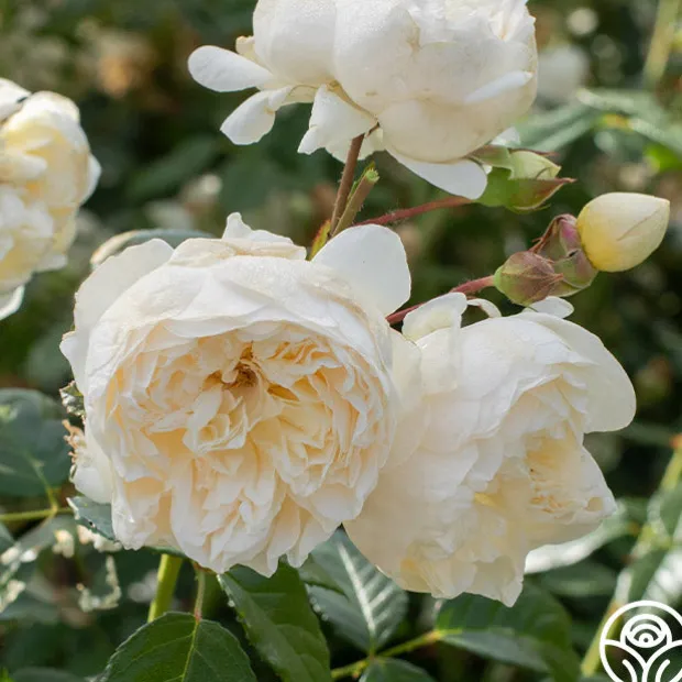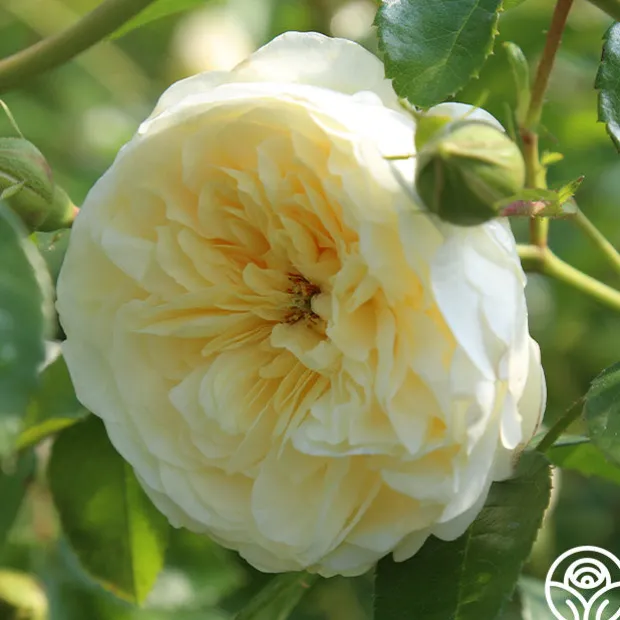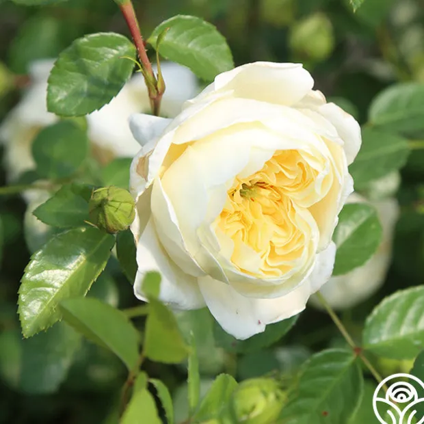 Perpetually Yours™ likes to show off with blossoms and blossoms of old fashioned 3” flowers in a soft yellow shading growing lighter toward the petal edges. Her flowers cover this continual blooming climbing English Legend rose. Grow her anywhere you please including on pillars, walls, trellises, posts, arbors and fences. Expect her to take off and grow upwards of 10-15’ tall.