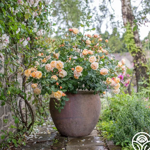 Literary lovers need this sweet, fruit-scented rose in their garden collection. The soft apricot and peach-colored English blooms are reminiscent of James and the Giant Peach and are continuously in bloom. This rose is a medium shrub that is incredibly robust, disease resistant, and nearly thornless. Roald Dahl can be planted in containers, borders, hedges, and even slightly shady locations.