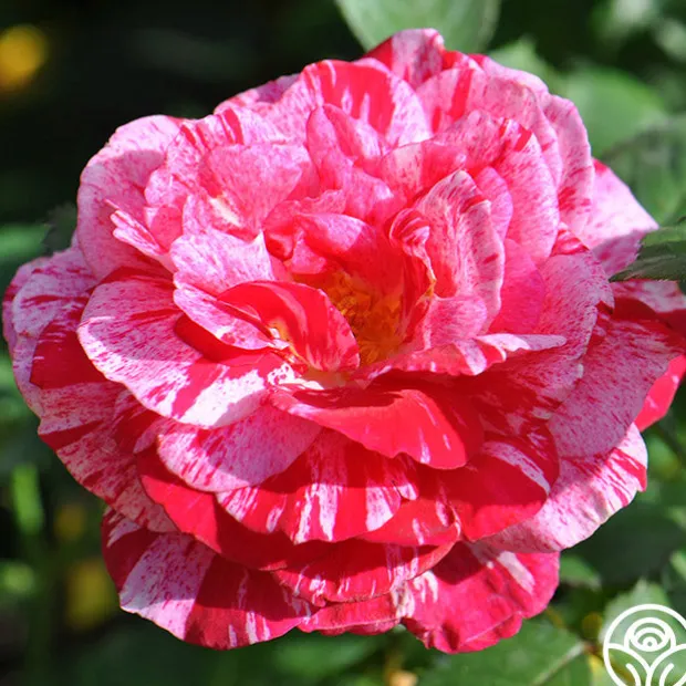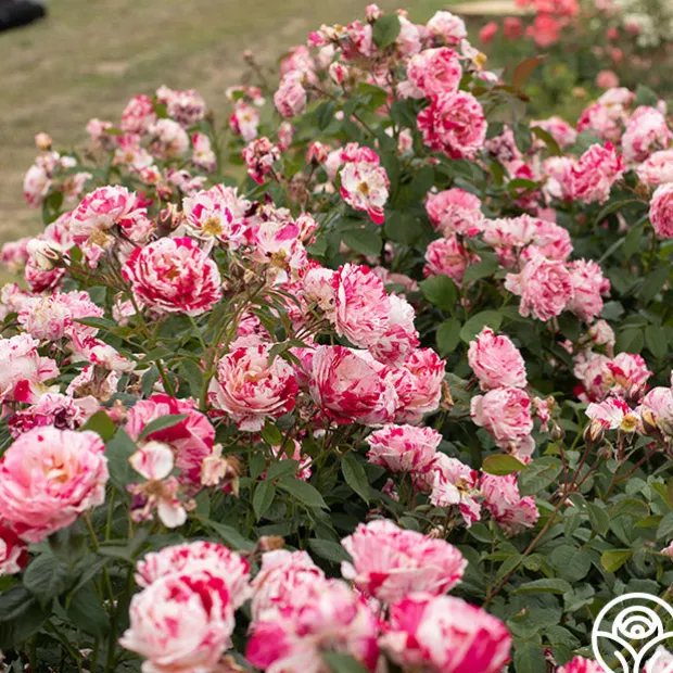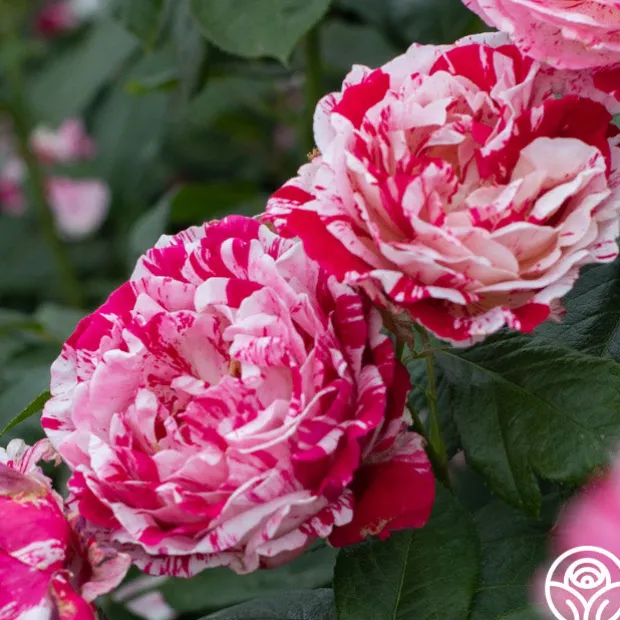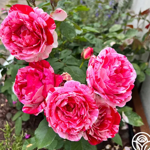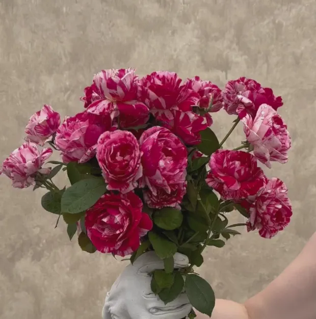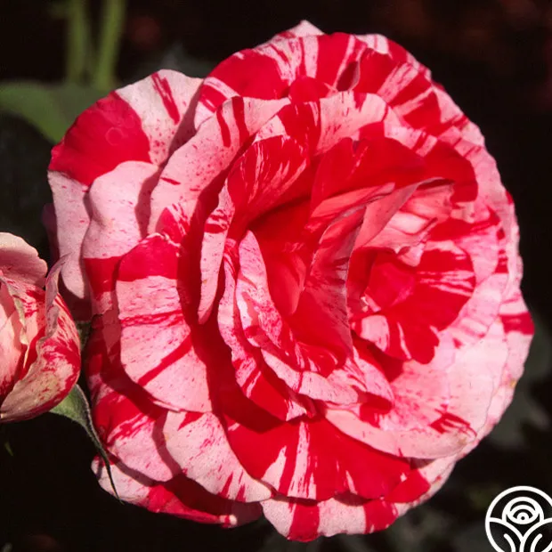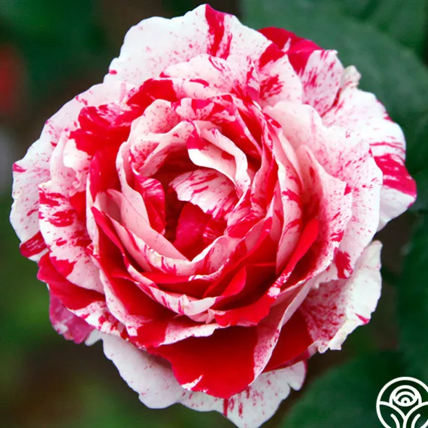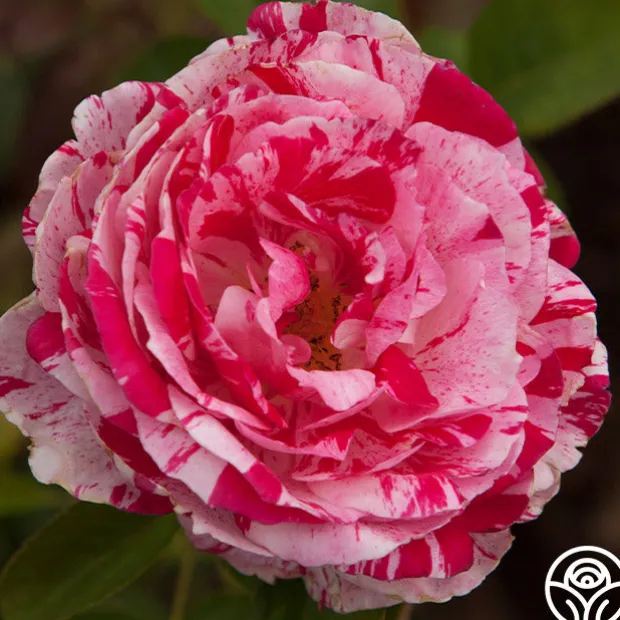 Scentimental™ is a beautiful, striped rose with burgundy-red 40+ petals swirled with creamy-white. Her large, fully double 4” blooms have an old-fashioned appearance and a strong, sweet and spicy fragrance. Each petal has unique patterns. Some are burgundy splashed white; some more cream swirled with red. Scentimental™ is a continuous blooming plant that is densely covered with dark green, leathery foliage. She is a great choice for dried petals too