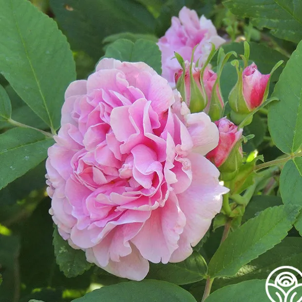 TOP SELLER! With the beauty of a Damask Rose, Thérése Bugnet has 4” blossoms with 30+, old-fashioned, ruffled petals in lilac pink. This repeat bloomer offers up a spicy fragrance that can vary from mild to very strong. Her blooms are produced on nearly thornless canes, featuring softer prickles.