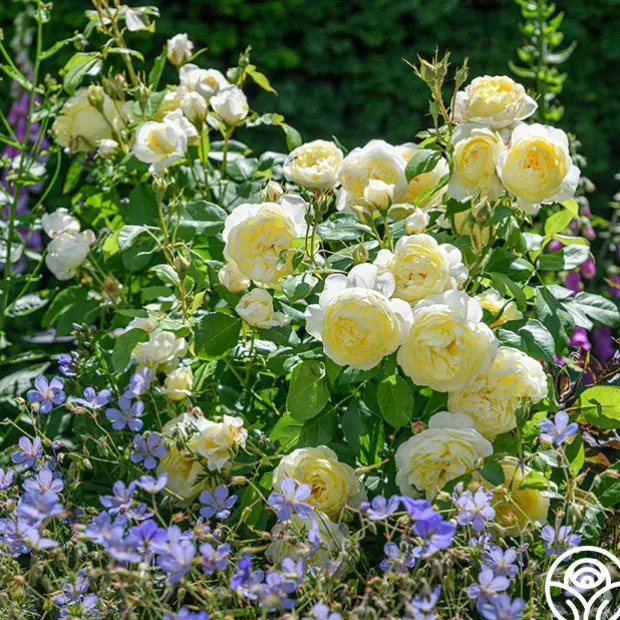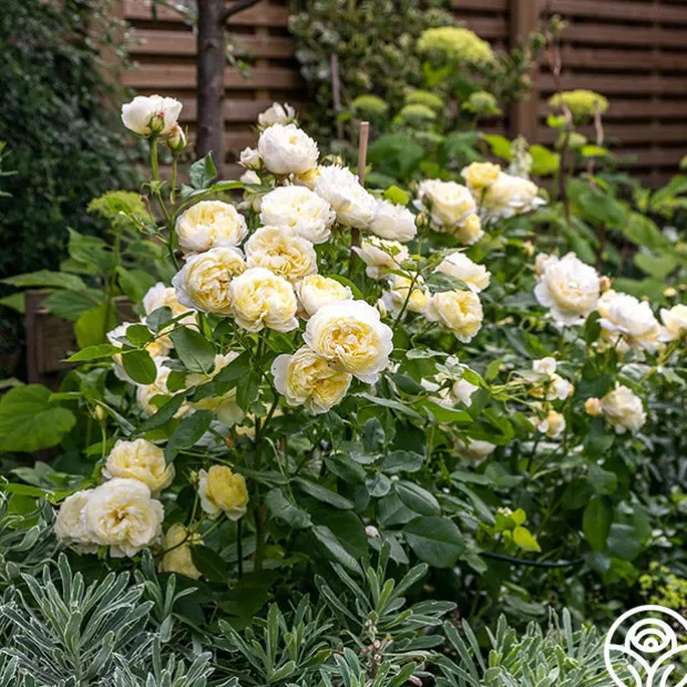 Vanessa Bell is a beautiful pale yellow English Shrub rose from David Austin with hints of pink on her buds opening to medium-sized blooms that fade to white on the edges. Her fragrance smells like a cup of green tea with honey and lemon. Expect an upright, bushy growth habit averaging 4′ x 3′. Choose Vanessa Bell for beds, borders, or pots. She can also handle some partial shade if needed!