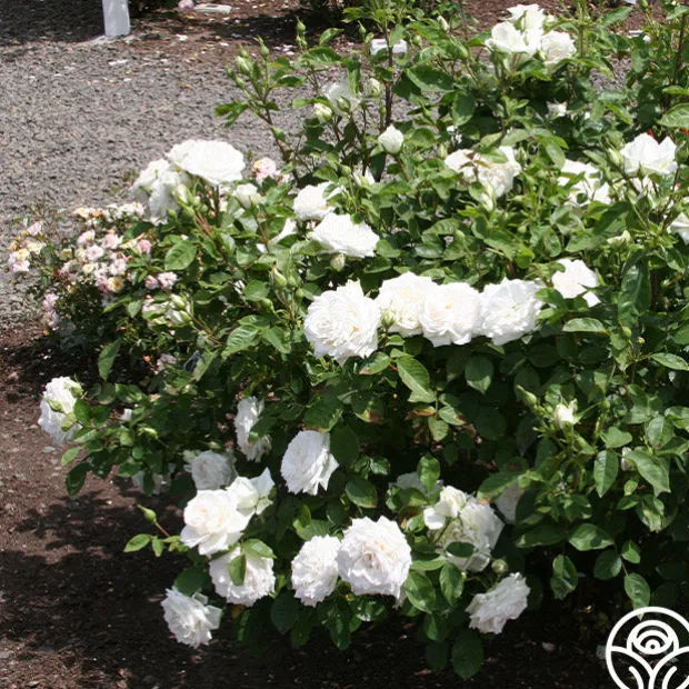 White Floorshow produces fully double, old-fashioned blooms of crystal white that are produced in profusion. Expect her to be a continually blooming and generously spreading plant with mounding growth and mid-green foliage. Great for your landscape or garden areas, she also does well in hard-to-grow places such as parking strips, boulevards, and curbs.